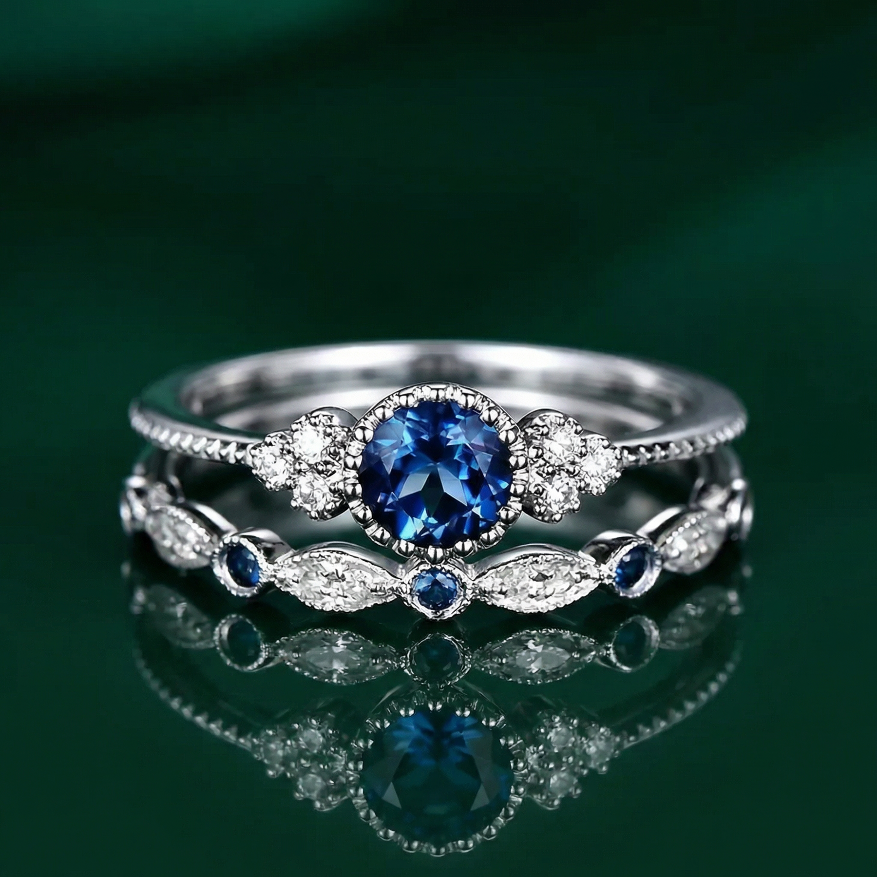 Regal Centerpiece: The engagement ring features a stunning round-cut navy sapphire surrounded by a milgrain halo, offering a royal aesthetic that stands out from traditional designs.
