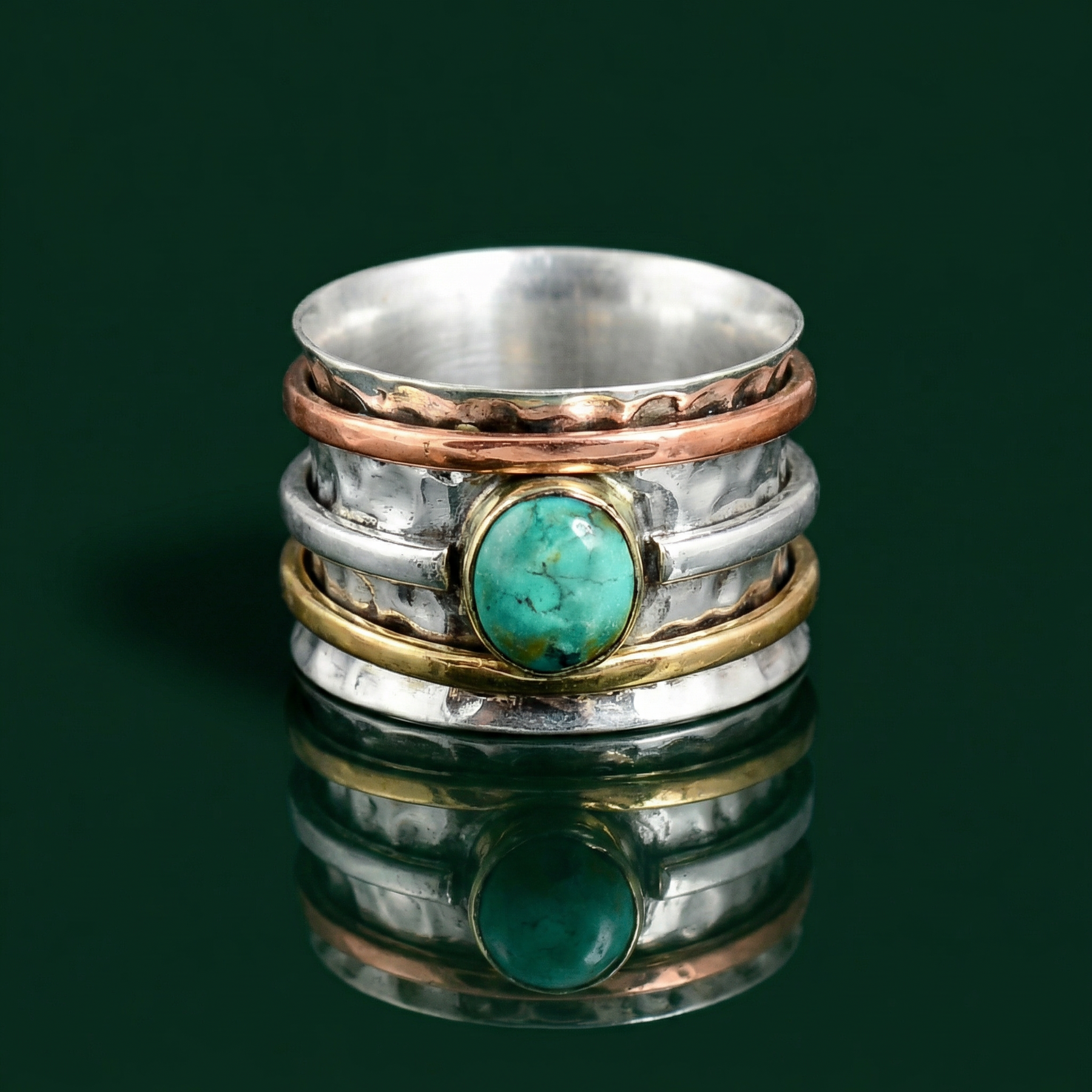 Striking Turquoise Centerpiece: This ring features a vibrant turquoise stone that serves as a bold focal point, bringing a splash of natural color and classic southwestern charm to your hand.