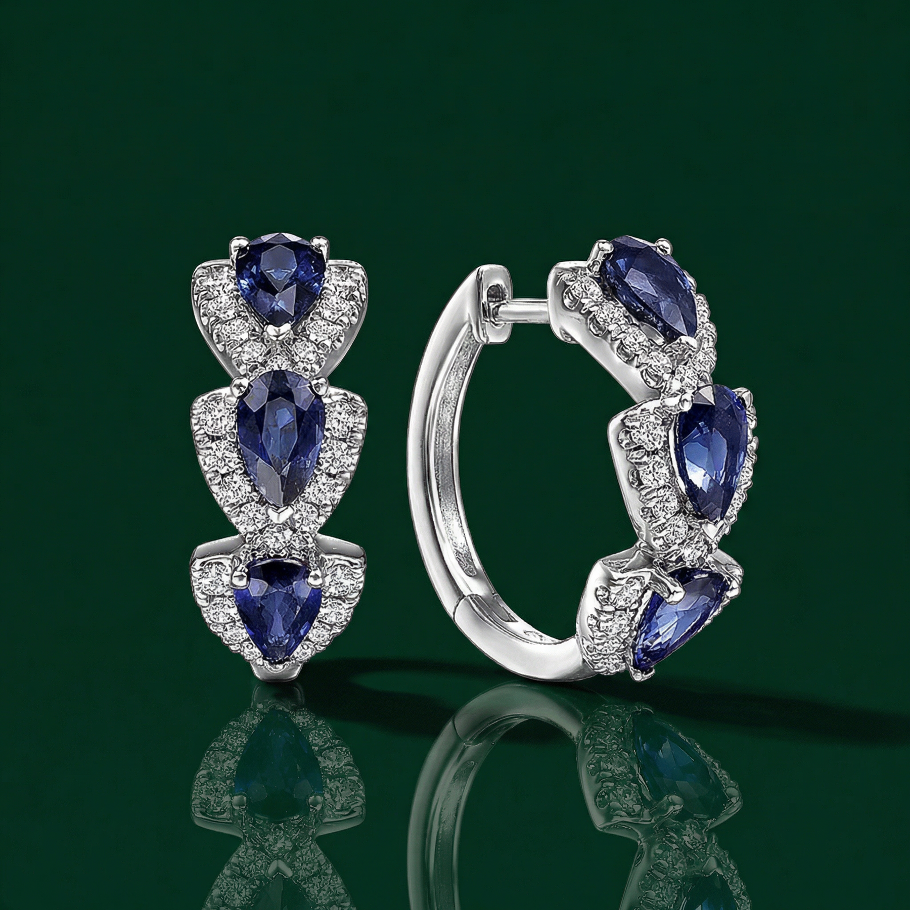 Capture the essence of noble beauty with a set of earrings designed to make a regal statement. These exquisite silver-toned hoops feature a triple-tier of vibrant pear-cut sapphires, each surrounded by a meticulous halo of shimmering crystals. It is the perfect choice for the modern woman who values sculptural elegance and high-impact brilliance for her most special occasions.